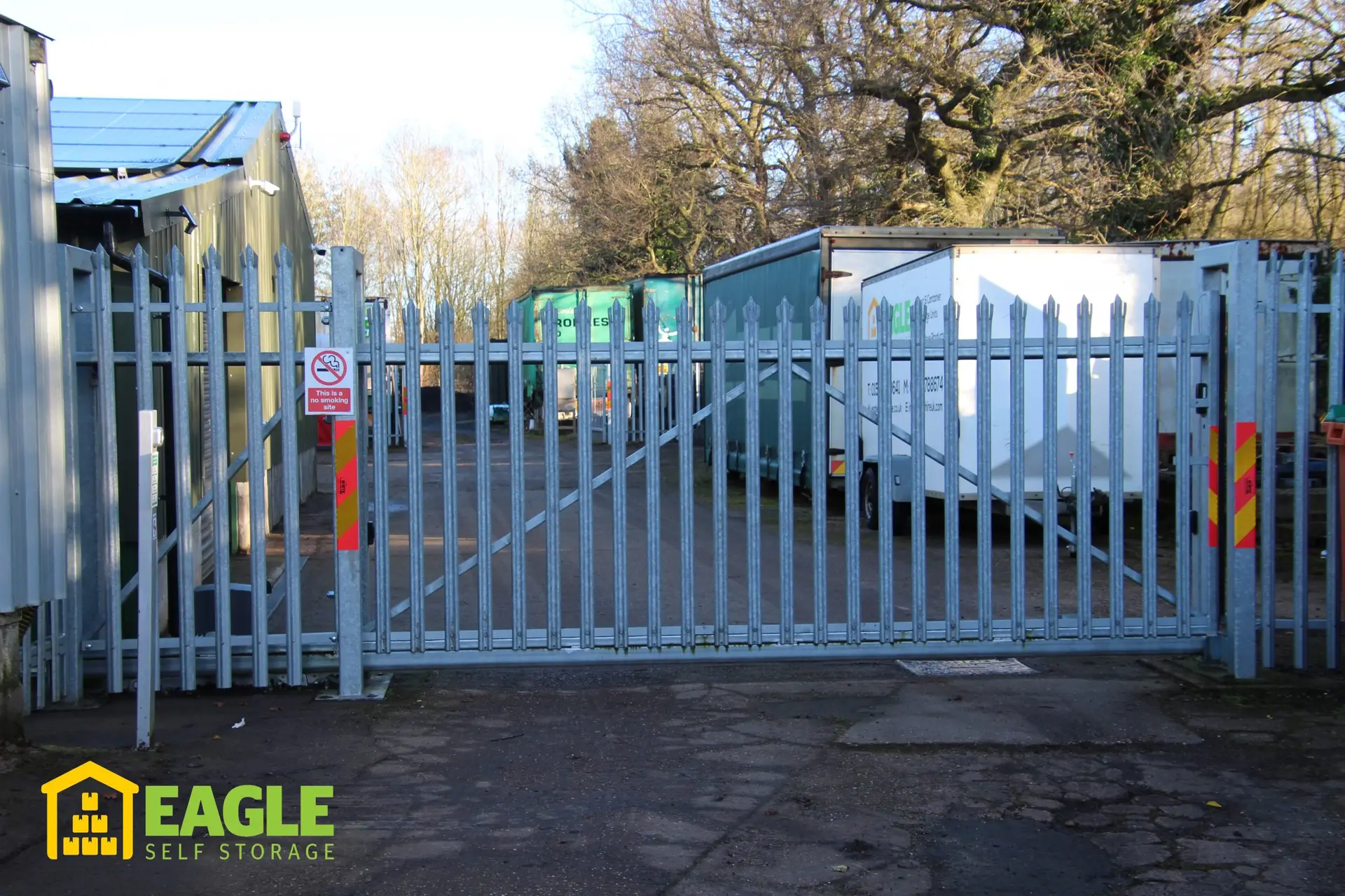 Here at Eagle Self Storage our site is surrounded by Palisade Security Fencing, the Buildings are secured with Steel Roller Shutter Doors, the whole site is covered by CCTV & Smoke Alarms are fitted should the unthinkable happen. We have a ‘State Of The Art’ Fob access system which gives access 7 days a week 6am – 8pm, access outside these times can be arranged. We live onsite & access is past the house & office, which gives additional security . Office hours are Mon – Fri 8am – 5pm other times as required, because we live onsite we don’t always stick to office hours.